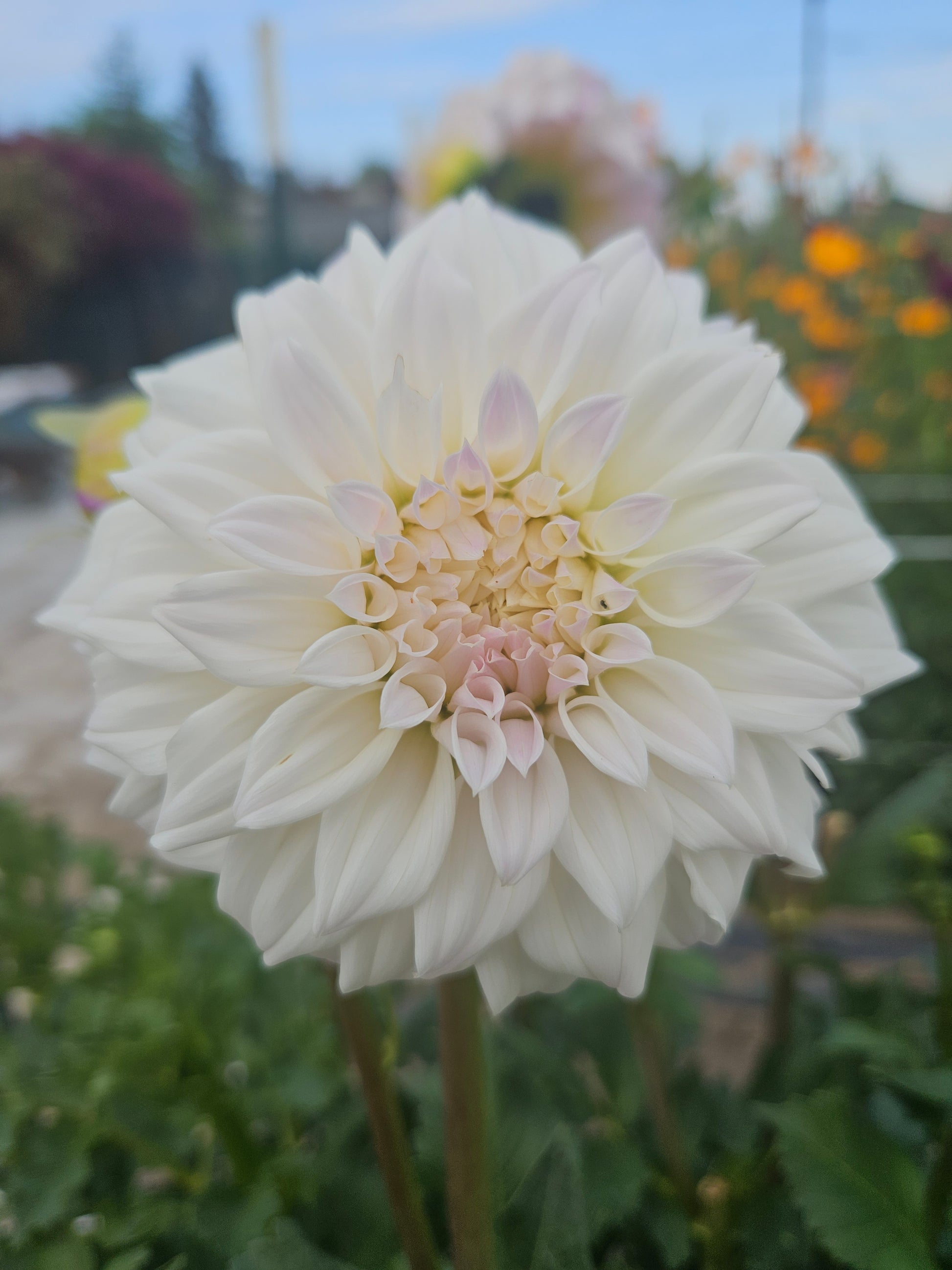 Who Me? Is a standout dahlia at over 5' tall. Perfect white petals curl back with a bit of lilac purple at the tips.
